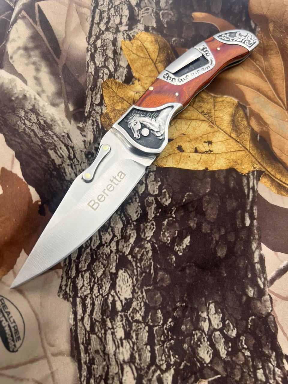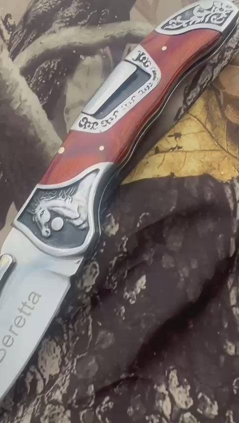 "The BERETTA HORSE POWER folding knife is expertly crafted with a color wood handle, providing both aesthetic appeal and a secure grip. With a total length of 205 mm and a blade length of 90 mm, this knife is the perfect blend of functionality and style."